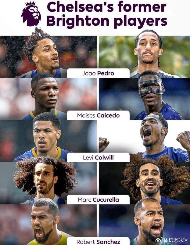 这5名前布莱顿的蓝军球员,分别是若昂佩德罗(2025年夏窗,以6370万欧元从布莱顿加盟切尔西)、莫伊塞斯凯塞多(2023年夏窗,以1.16亿欧元从布莱顿加盟切尔西)、科尔威尔(2022年夏窗租借至布莱顿,2023年回归切尔西)、库库雷利亚(2022年夏窗,以6530万欧元从布莱顿加盟切尔西)、罗伯特桑切斯(2023年夏窗,以2300万欧元从布莱顿加盟切尔西)。